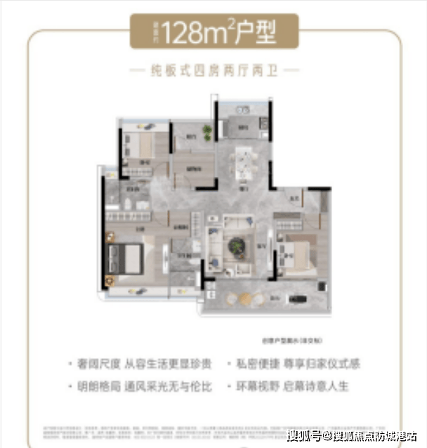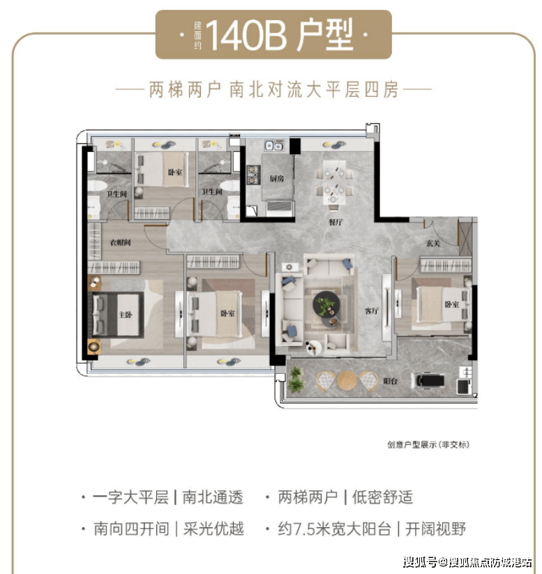 对于多人口家庭,或者想要一步到位的改善家庭来说,建面约140-143㎡的四室两厅两卫户型,绝对是不二之选。这个户型采用2梯2户设计,专梯入户,能够极大地提升业主的居住私密性和尊贵感,不用忍受挤电梯的烦恼,而且入户玄关空间宽敞,可以摆放鞋柜、衣柜等,实用性很强。